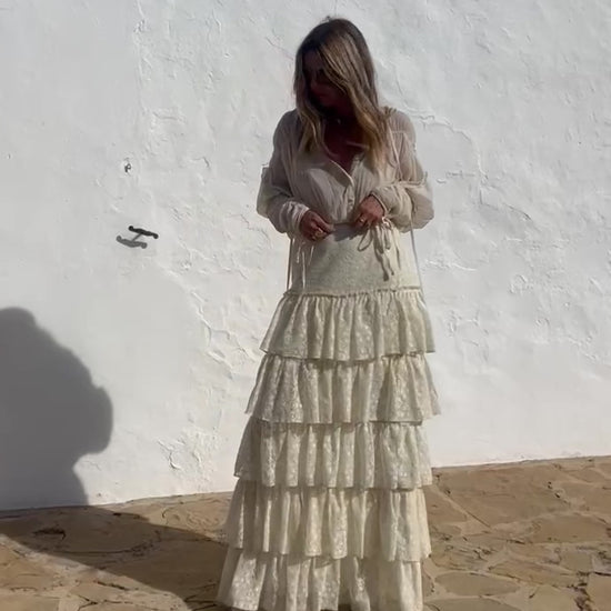 The maxi-skirt has a dropped waist and layered tiers. Style with a T’shirt, oversized blazer or over body/swimwear; comes with an unattached slip skirt for styling with ease.