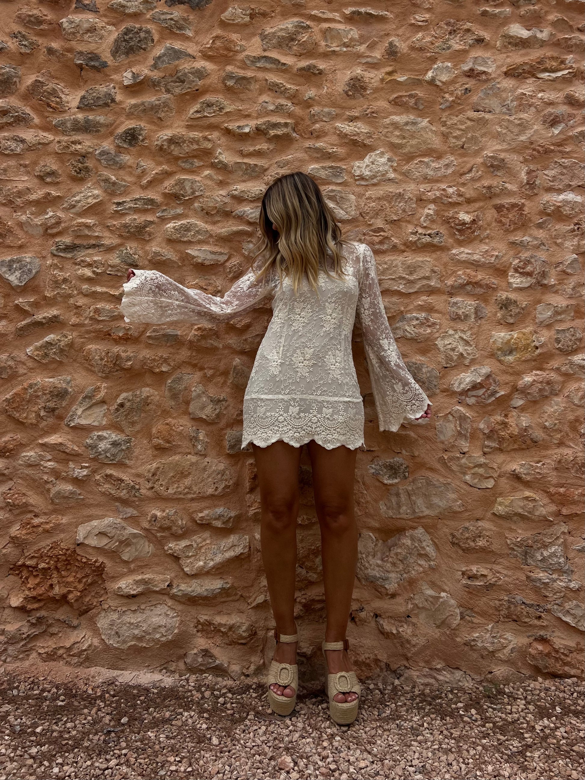 Tie neck with an open back in a non stretch lace fabric